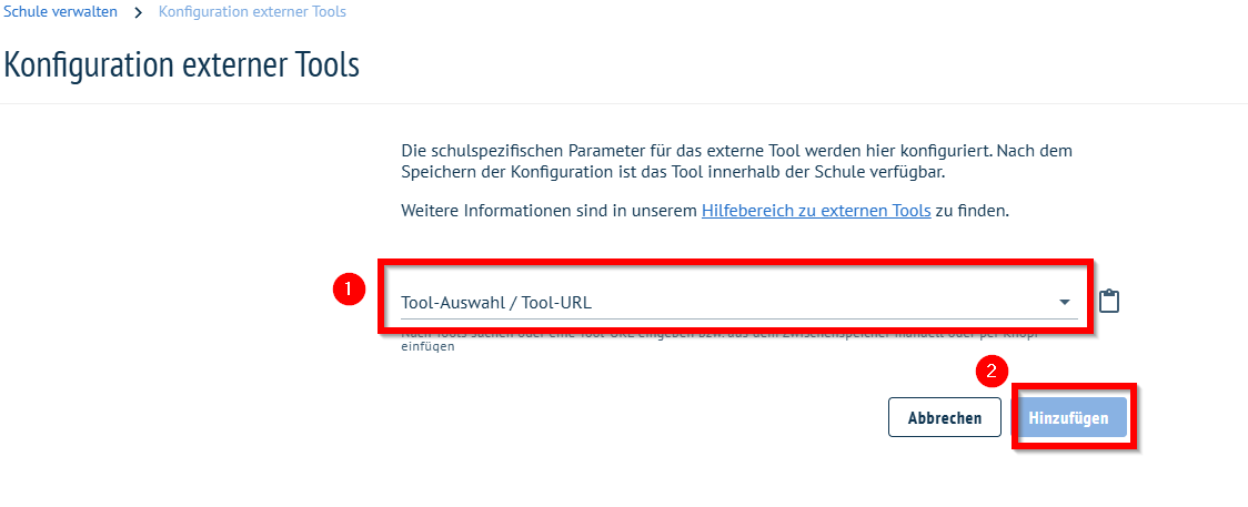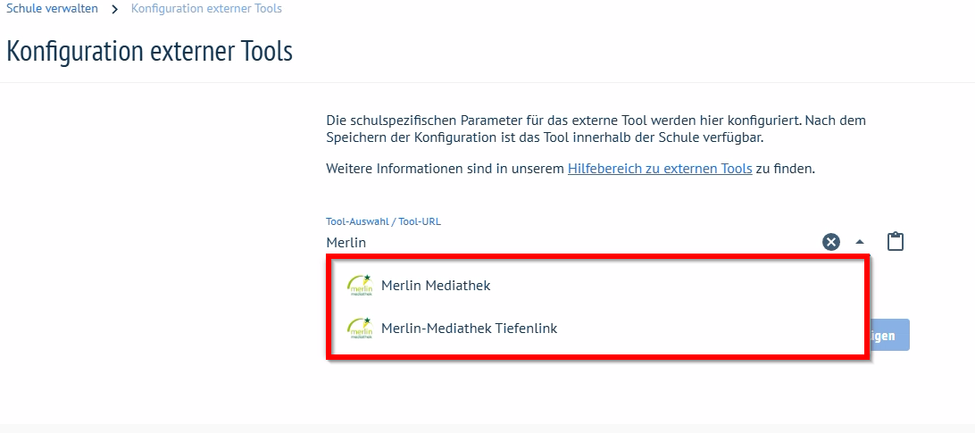 Um die Merlin-Mediathek in der NBC nutzen zu können, sind zwei externe Tools hinzuzufügen. Dazu auf den blauen Button „Externes Tool hinzufügen” (1) klicken. Es öffnet sich eine Konfigurationsseite. Hier kann immer ein Tool hinzugefügt werden. Dazu im Feld "Tool-Auswahl/ Tool-URL (1) das Stichwort Merlin eingeben.