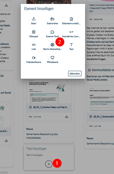 In dem Übersichtsfeld den Button Merlin- Mediathek (2) auswählen. Hier wird dann auf die Merlin-Mediathek verlinkt und dort kann dann ein konkretes Medium zum Verlinken ausgewählt werden.