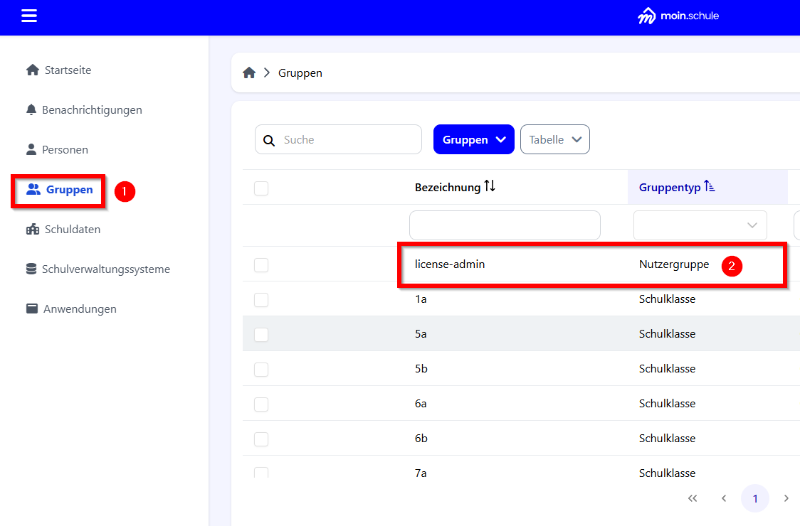 Hier die Gruppe „license-admin" mit dem Gruppentyp „Nutzergruppe" suchen. Diese Gruppe „license-admin" ist automatisch in moin.schule angelegt.