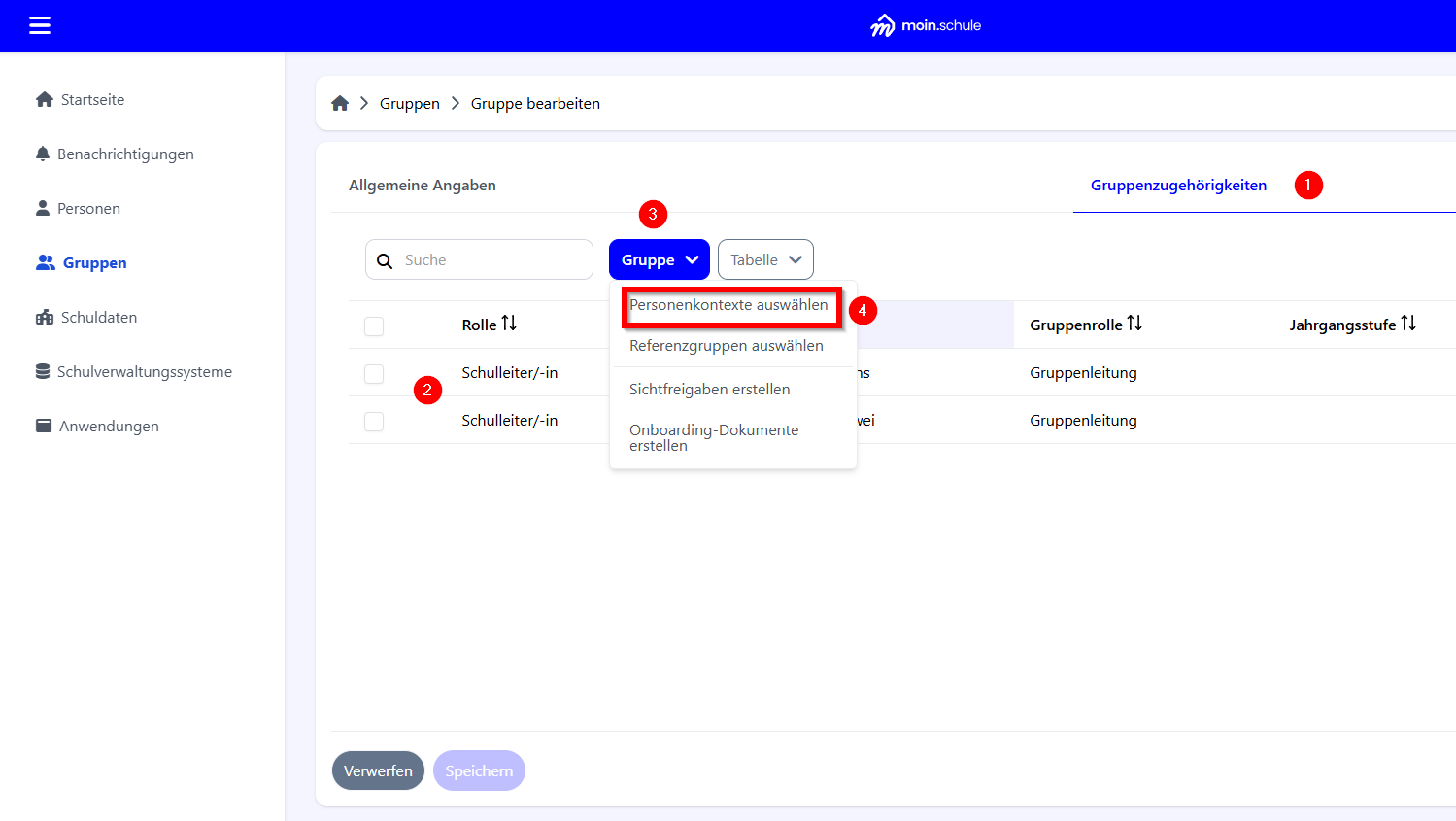 Um weitere Personen der Nutzergruppe hinzuzufügen, oberhalb der Liste auf das Drop-Down-Menü „Gruppen“ gehen und die Funktion „Personenkontexte auswählen" (4) öffnen. Eine detaillierte Beschreibung zum Hinzufügen der gewünschten Personen findet sich unter Einer Gruppe Mitglieder hinzufügen zu finden.