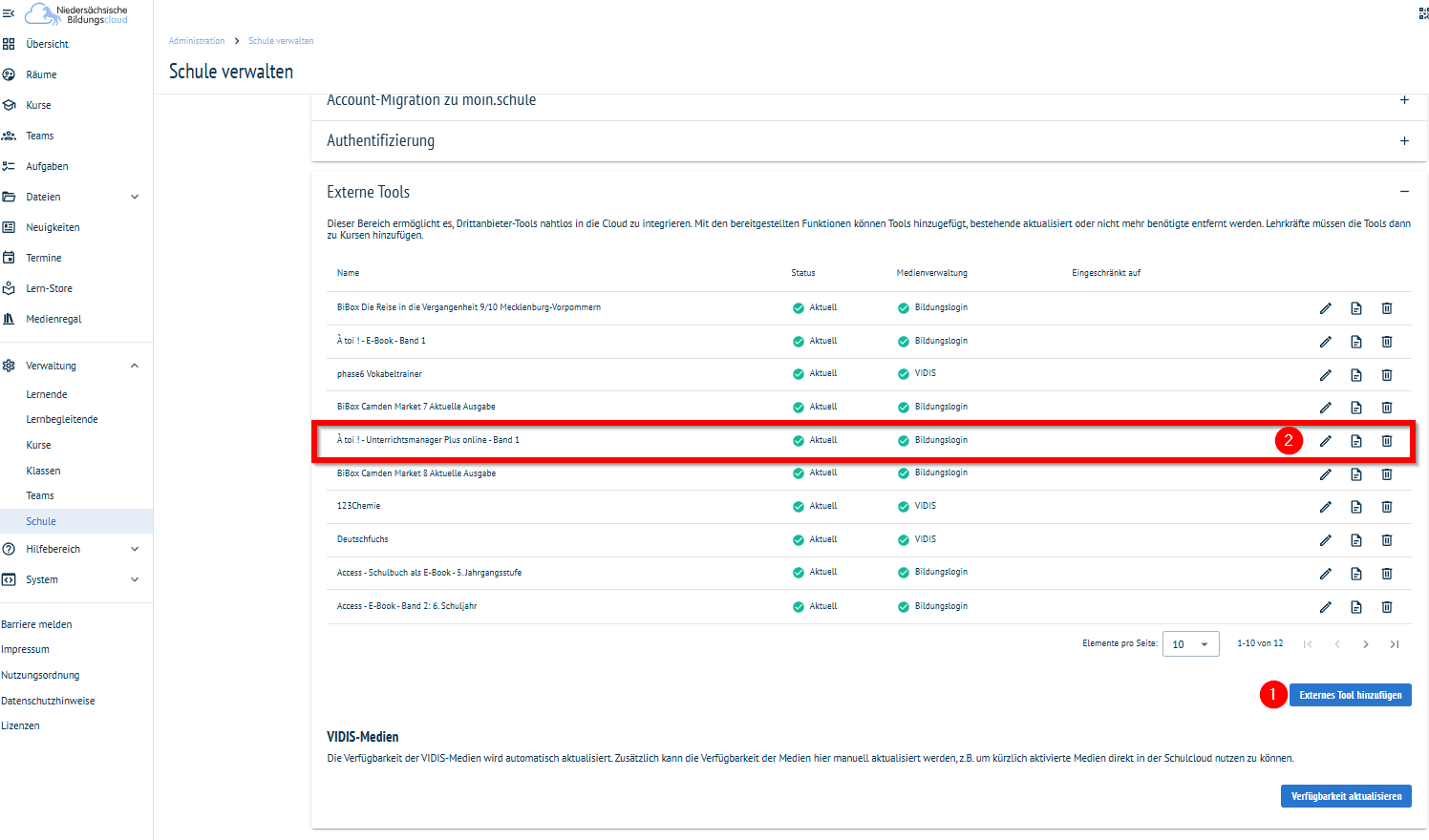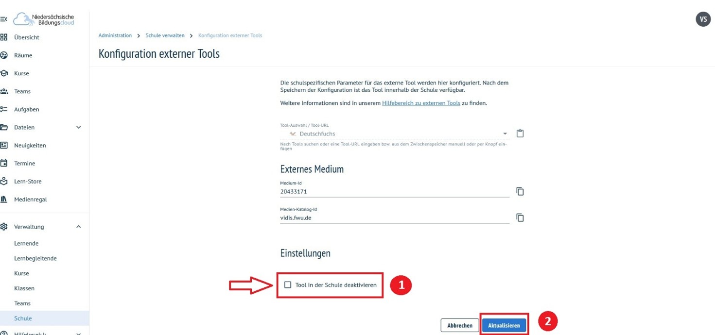 Button „Bleistift" (2): Durch Klicken des „Bleistift"-Buttons öffnet sich ein neues Fenster. Hier ist es möglich, das Tool wieder zu deaktivieren. Dazu ist ein Haken bei „Tool in der Schule deaktivieren” (1) zu setzen. Anschließend ist die Änderung mit einem Klick auf den Button „Aktualisieren” (2) zu speichern.