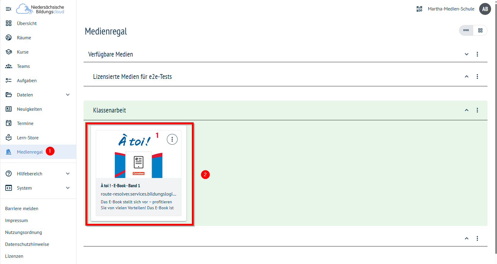 Im Hauptfenster öffnet sich ein Dashboard mit allen dem Nutzenden zur Verfügung stehenden Anwendungen. Hier findet sich nun das freigeschaltete Schulbuch, für das eine Lizenz vorhanden ist (2).