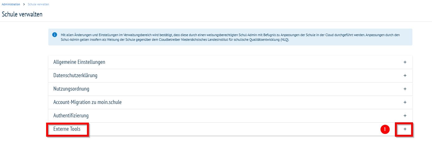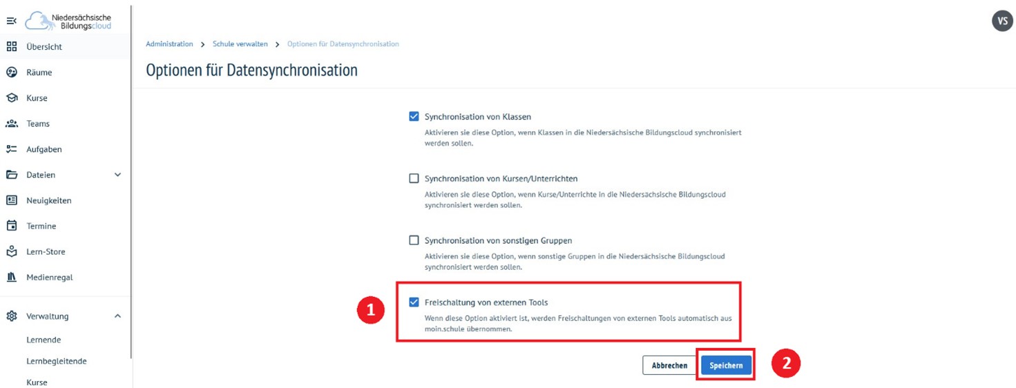 Hier ist ein Haken bei dem Punkt „Freischaltung von externen Tools" (1) zu setzen. Dieser Haken ermöglicht, dass in moin.schule freigeschaltete Anwendungen direkt auch in der NBC freigegeben sind.
