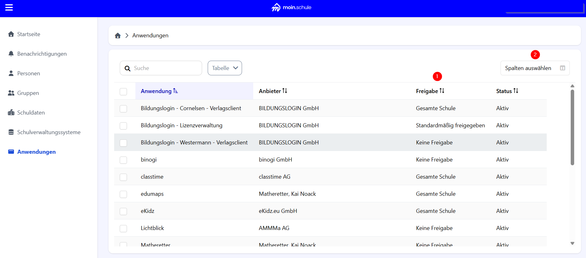In der Überblicksliste der Anwendungen gibt es die Spalte „Freigabe" (1). Hier kann der/die Schuladministrator/-in sehen, welche Anwendungen in der Schule für welchen Nutzerkreis freigeschaltet sind.