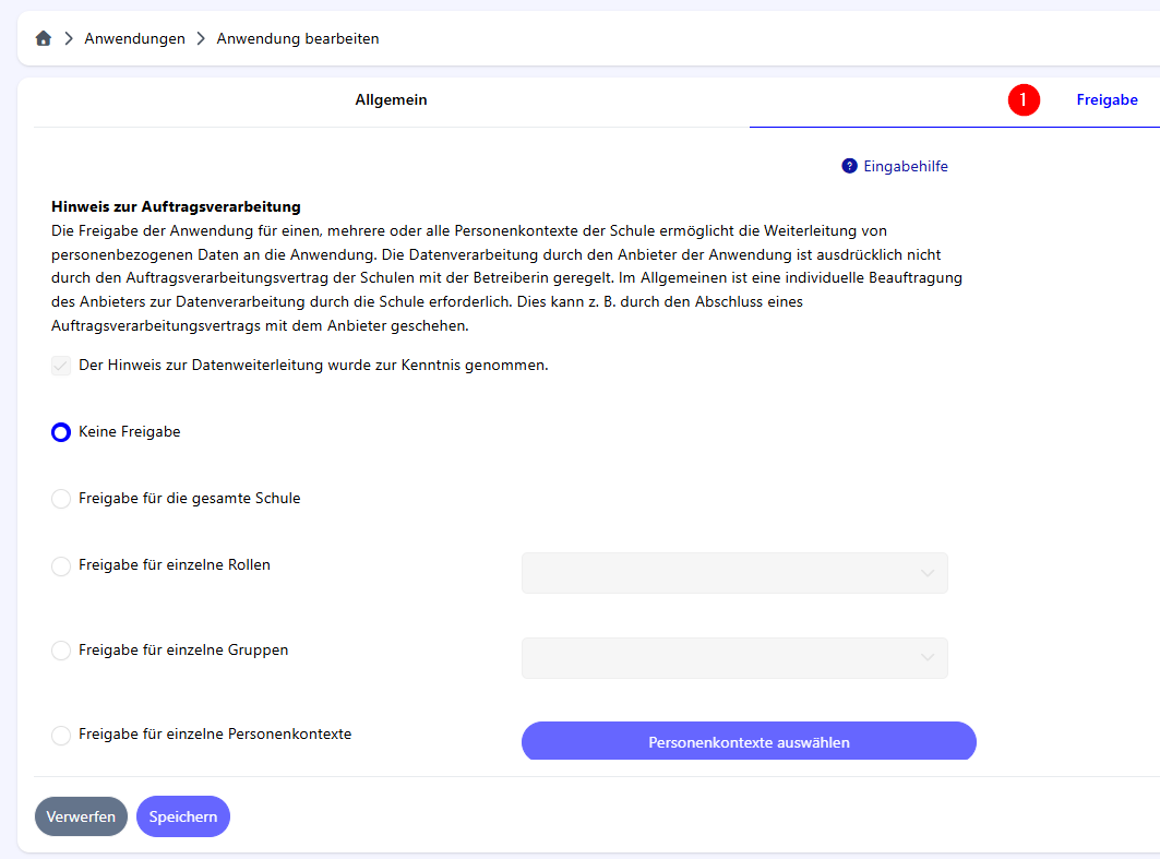 Im Reiter „Freigabe" (1) wird festgelegt, welche Personen an der Schule die Anwendung über moin.schule nutzen können.