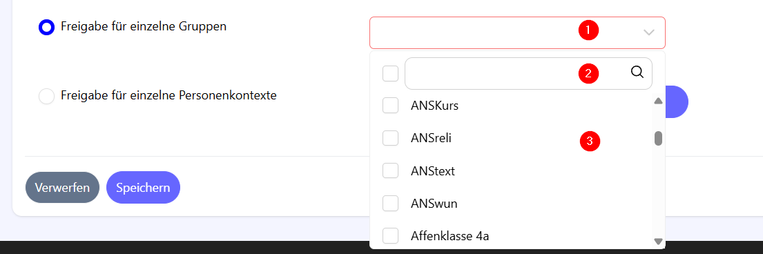 Der Klick auf diese Option aktiviert das danebenstehende Drop-Down-Menü (1). Darin können einzelne oder mehrere Gruppen ausgewählt werden, die Zugriff auf die Anwendung haben sollen (3). Über das Suchfeld (2) können die Gruppen auch hinzugefügt werden.