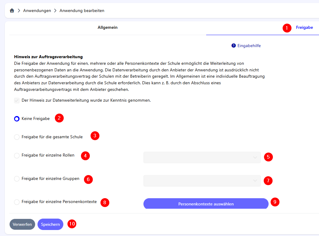 Die Freigabe der Anwendung für einen, mehrere oder alle Personenkontexte der Schule ermöglicht die Weiterleitung von personenbezogenen Daten an die Anwendung. Die Datenverarbeitung durch den Anbieter der Anwendung ist ausdrücklich nicht durch den Auftragsverarbeitungsvertrag der Schulen mit der Betreiberin geregelt. Im Allgemeinen ist eine individuelle Beauftragung des Anbieters zur Datenverarbeitung durch die Schule erforderlich. Dies kann z. B. durch den Abschluss eines Auftragsverarbeitungsvertrags mit dem Anbieter geschehen.