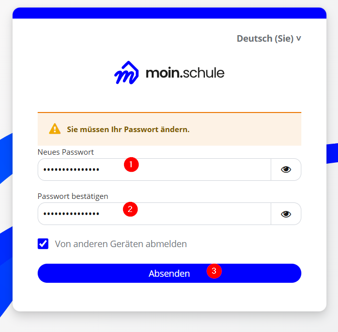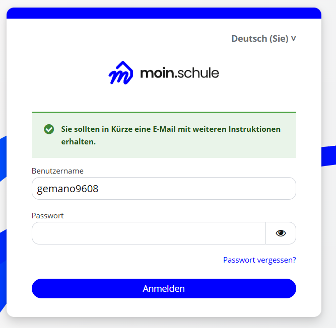 Wichtig: Eine Voraussetzung zur Nutzung von moin.schule ist die Verwendung von sicheren Passwörtern. Passwörter sind sicher, wenn sie lang sind. Ein Passwort für moin.schule muss daher mindestens 15 Zeichen lang sein. Weitere Informationen sind auf der Seite Sichere Passwörter zu finden. |
