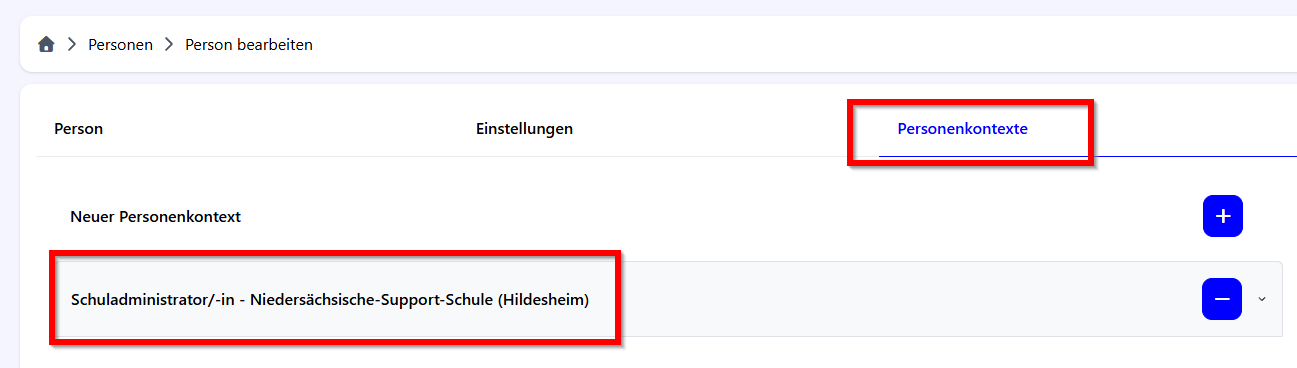 Mit einem Klick auf die zu ändernde Person öffnet sich die Detailansicht der Person. Unterhalb der Überschrift „Personenkontexte“ kann der Personenkontext Schuladministrator/in angepasst werden.