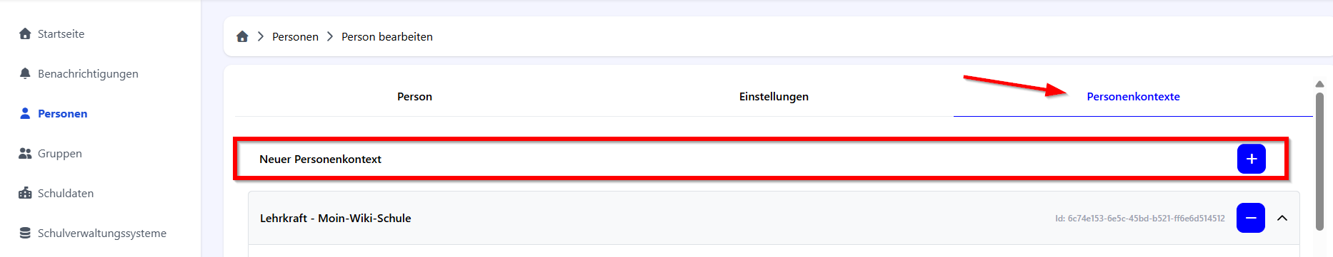 In der ersten Zeile „Neuer Personenkontext" kann über den blauen Button „+" ein neuer Personenkontext hinzugefügt werden.