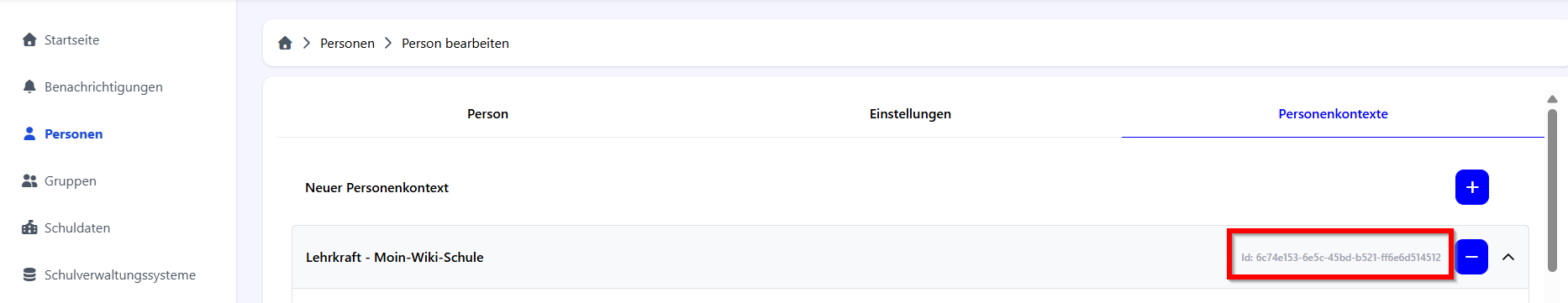 Jeder Personenkontext hat eine eindeutige moin.schule-ID (UUID). Diese wird in der Detailansicht einer Person unter dem Reiter „Personenkontexte" beim jeweiligen Personenkontext angezeigt.